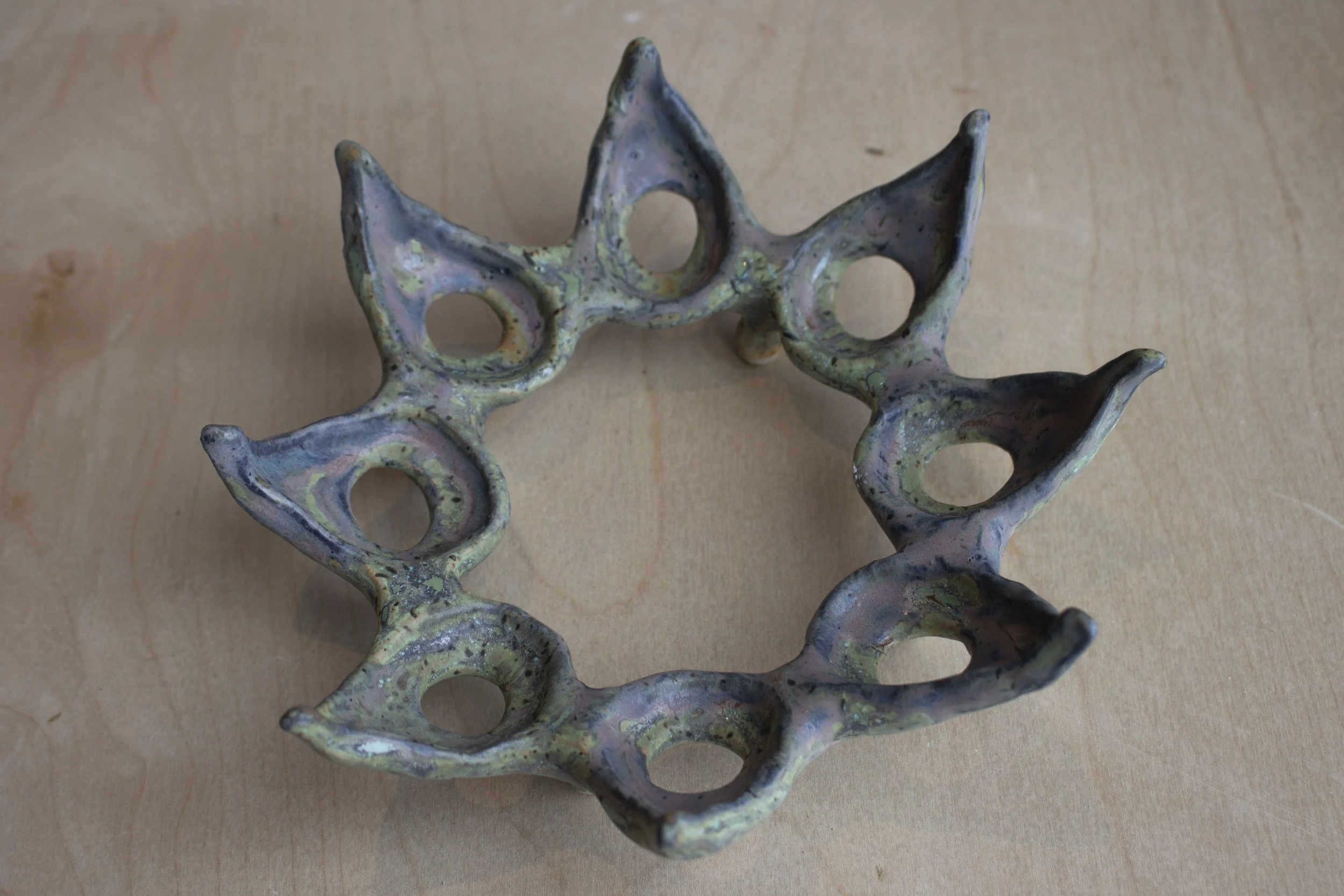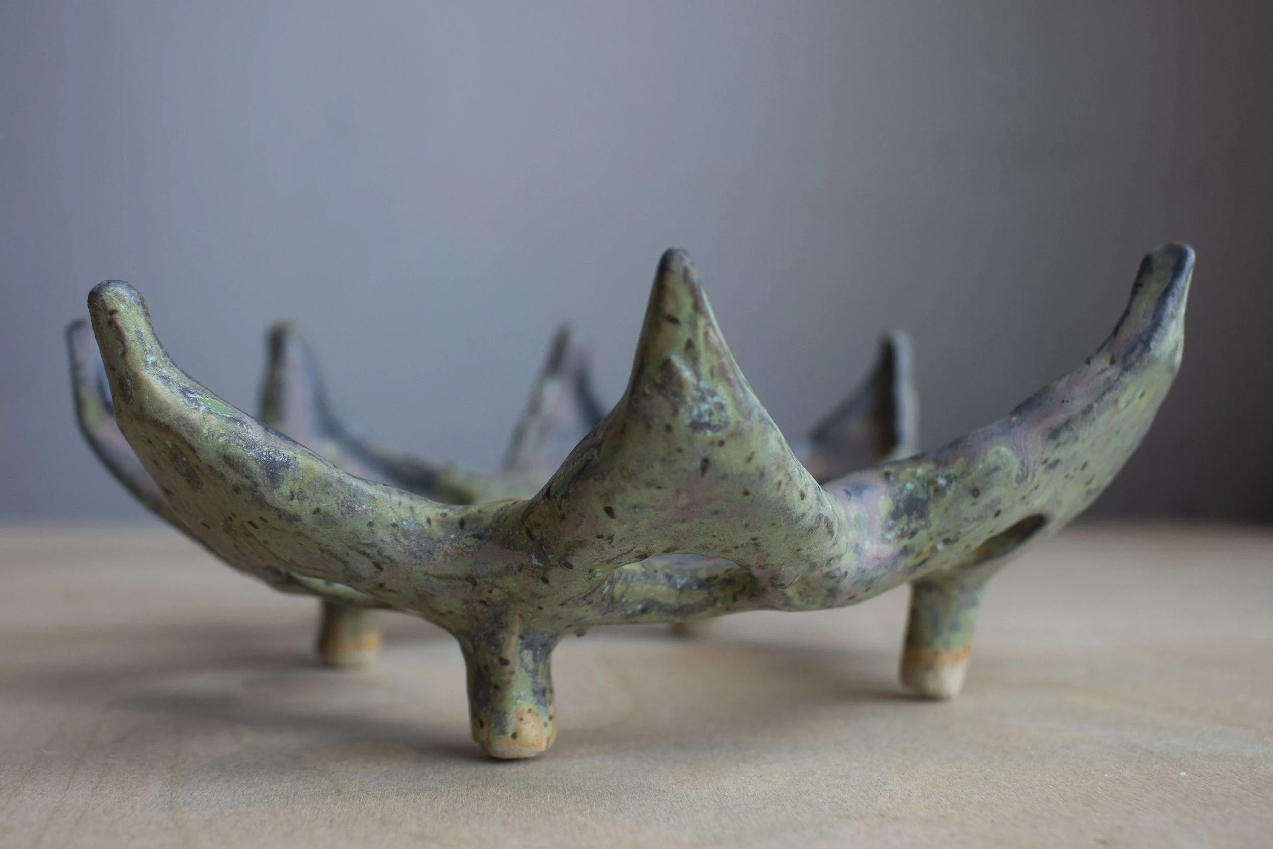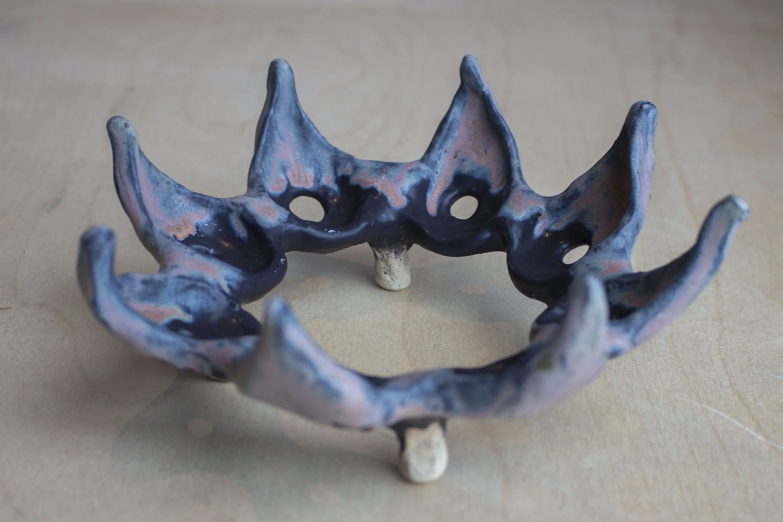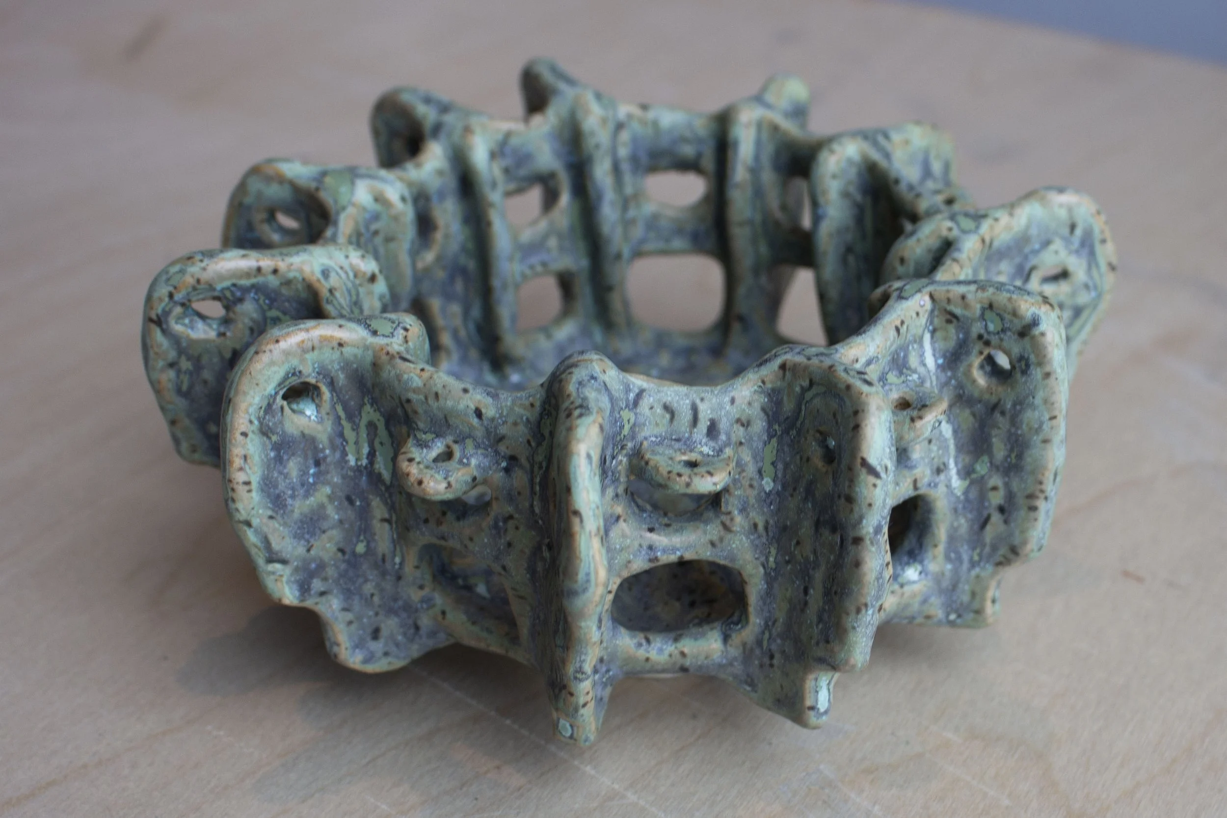 Shannon’s ceramic work explores the skelatal qualities of thrown and pinched clay. Her wares are reminicent of the rocks, bones, and lichen coated dishware that wash ashore harbours and beaches the artist explored growing up (and still now).